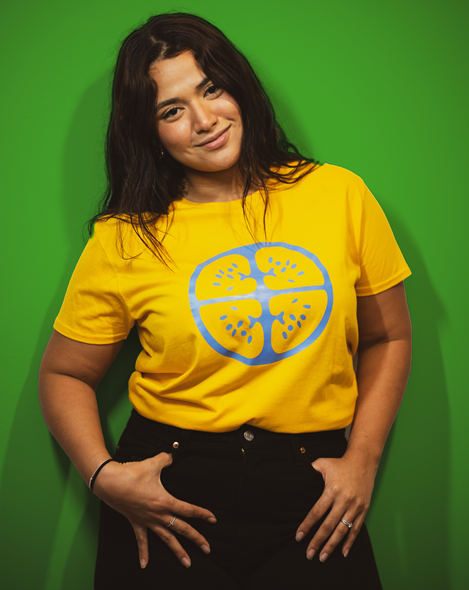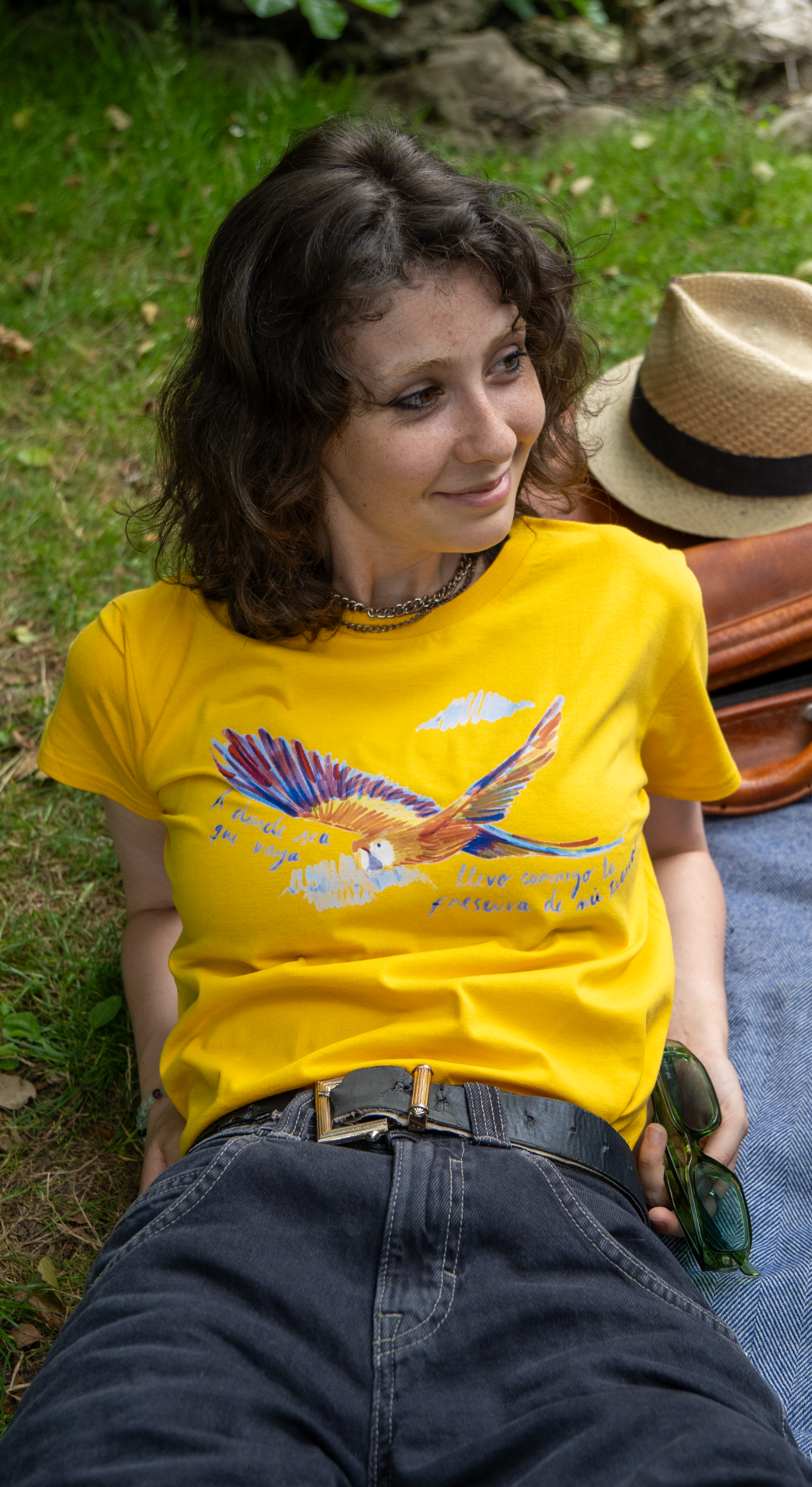 Modèle casquette nc avec design 'Lulo jaune petit format'.